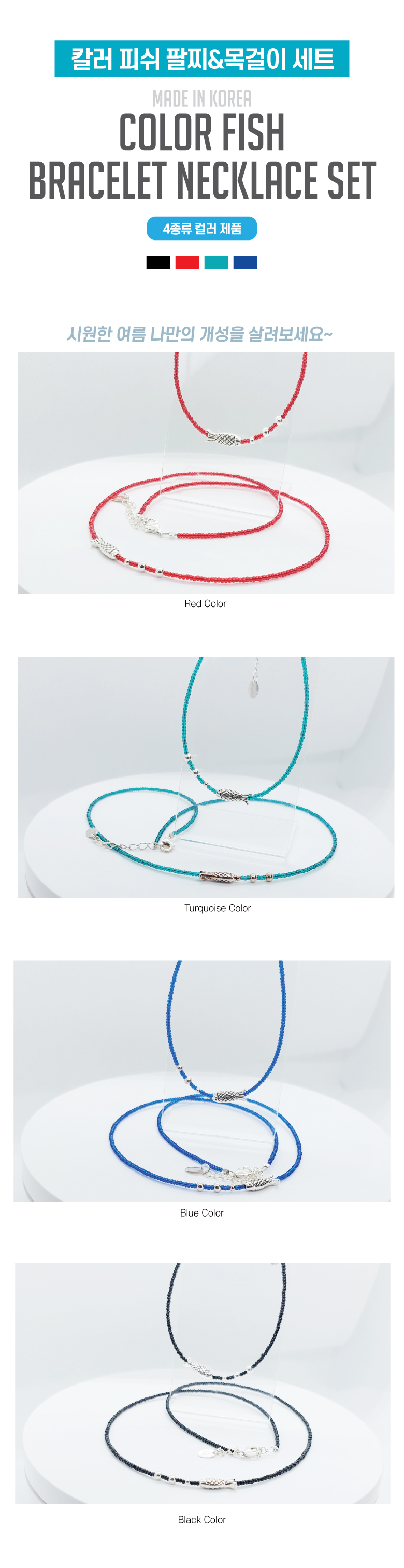 네가지 컬러의 구슬로 구성된 팔찌, 목걸이에 은으로 만든 물고기와 물방울 모양의 구슬이 달려있는 개성있고 깔끔한 팔찌 & 목걸이 세트입니다.